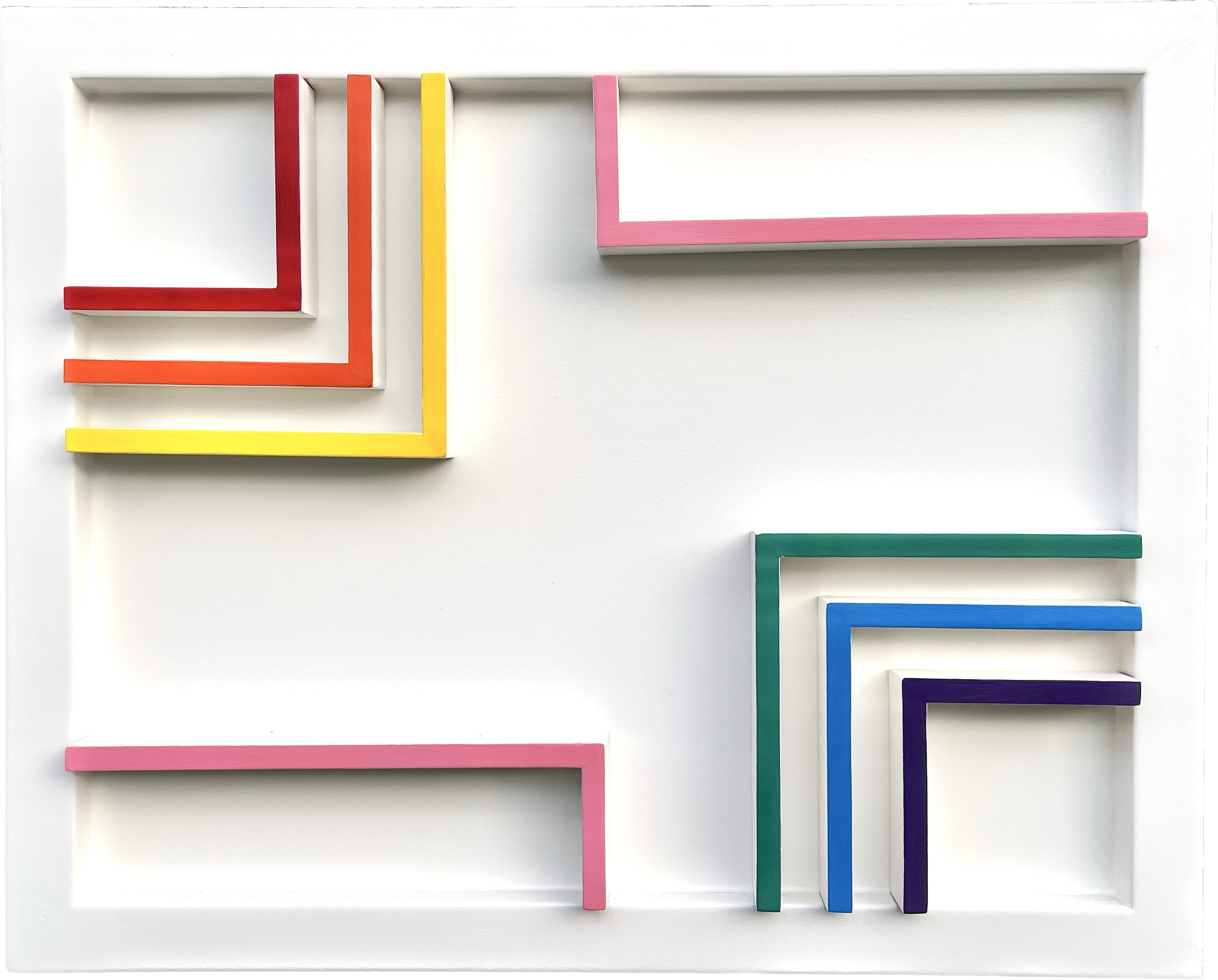 This colourful work plays with the trickery of optics. The reflection, refraction and dispersion of light can both illuminate and obscure. Colour bursts out from white light due to minute changes in the angles of different wavelengths. The piece is inspired by the hard corners and bouncing lights of a metropolis.
